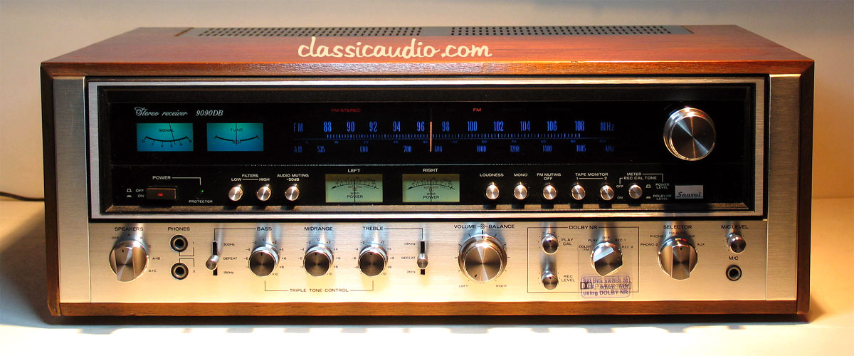 The Sansui 9090DB features a 125wpc power amplifier section, direct readout power meters, an AM/FM analog tuner, Dolby noise reduction circuit, Bass, Midrange and Treble controls (defeatable), two tape loops and a Moving Magnet Phono stage.