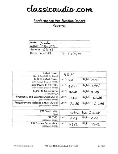 Yamaha model CR-800 receiver in very good condition. Rated at 45 watts RMS per channel into 8 ohms and 55 watts RMS per channel into 4 ohms. It has been serviced. Includes a copy of the owner's manual and our original Performance Verification Report.
